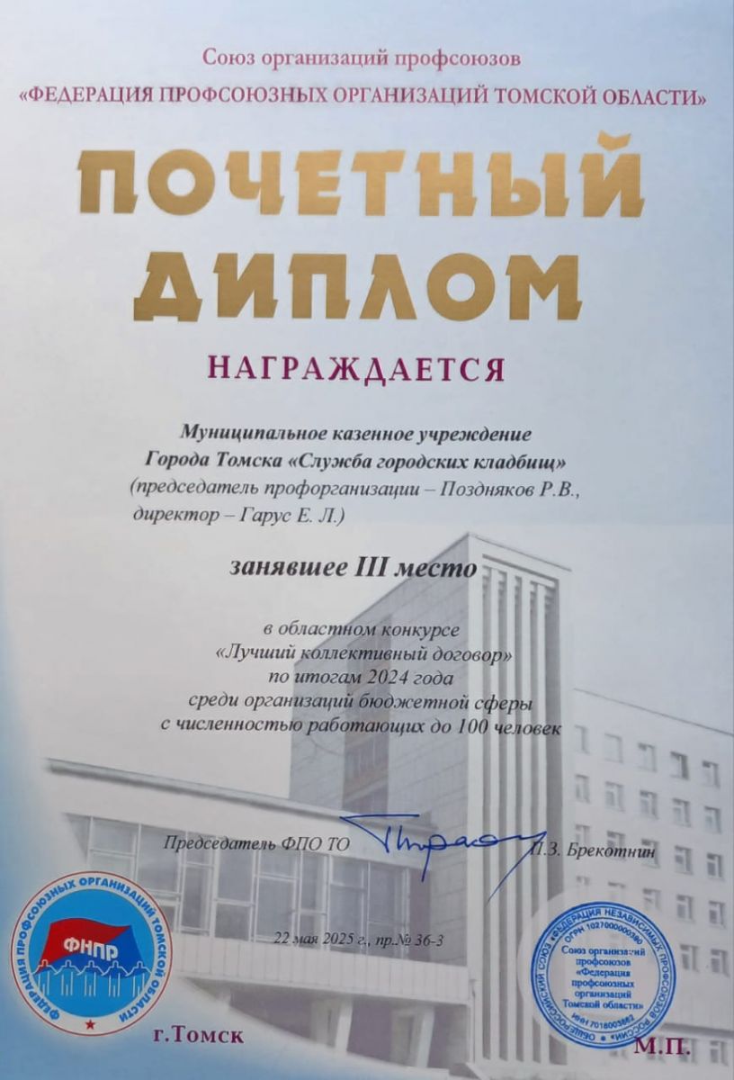 Союз организаций профсоюзов "Федерация профсоюзных организаций Томской области" наградил Муниципальное казенное учреждение Города Томска "Служба городских кладбищ", занявшее III место в областном конкурсе "Лучший коллективный договор" по итогам  2024 года среди организаций бюджетной сферы с численностью работающих до 100 человек.